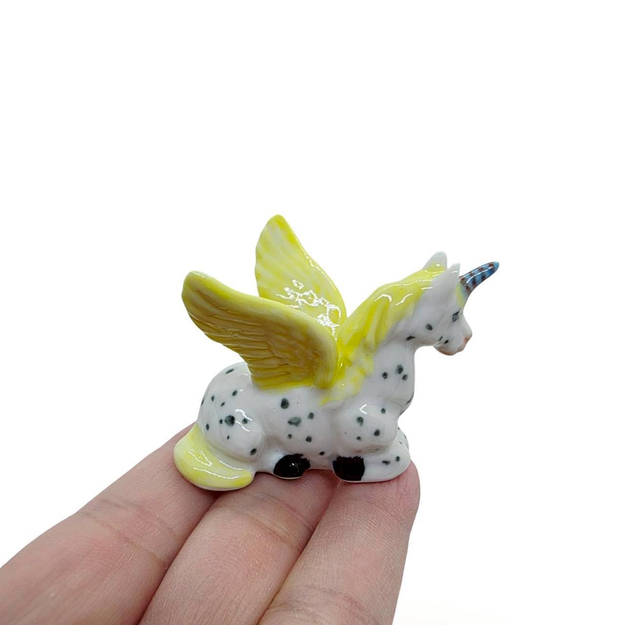WitnyStore 2" White Yellow Crouch Unipegasus Unicorn Pegasus Ceramic Mythical Horse Figurine Terrarium Decoration Collectible Statue for Adult Collectors Handcrafted Porcelain Sculpture Tabletop Decor