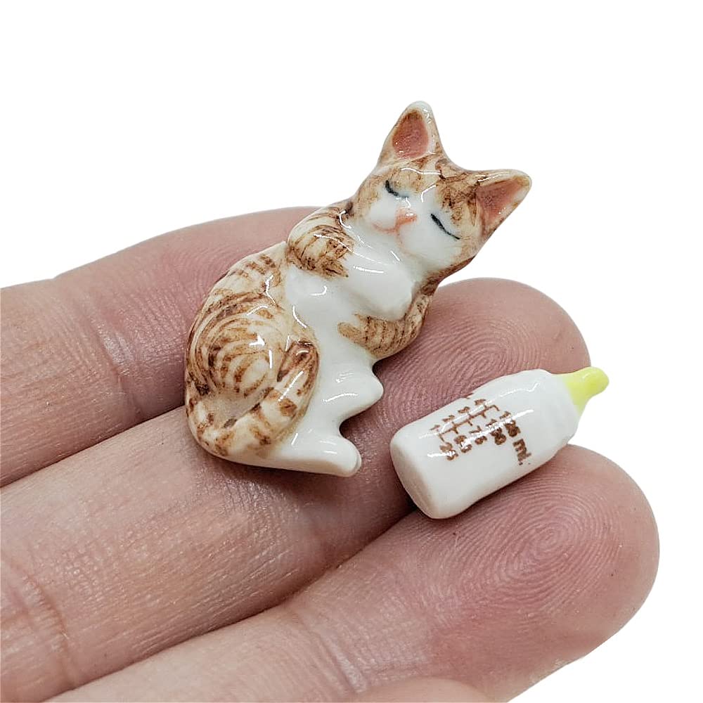 WitnyStore Tiny 1" Long White Brown Tabby Cat Sleeping with Baby Bottle - Miniature Hand Made Painted Ceramic Cats Kitten Feline Animal Cute Porcelain Decorative Collectible Figurines Décor Gifts