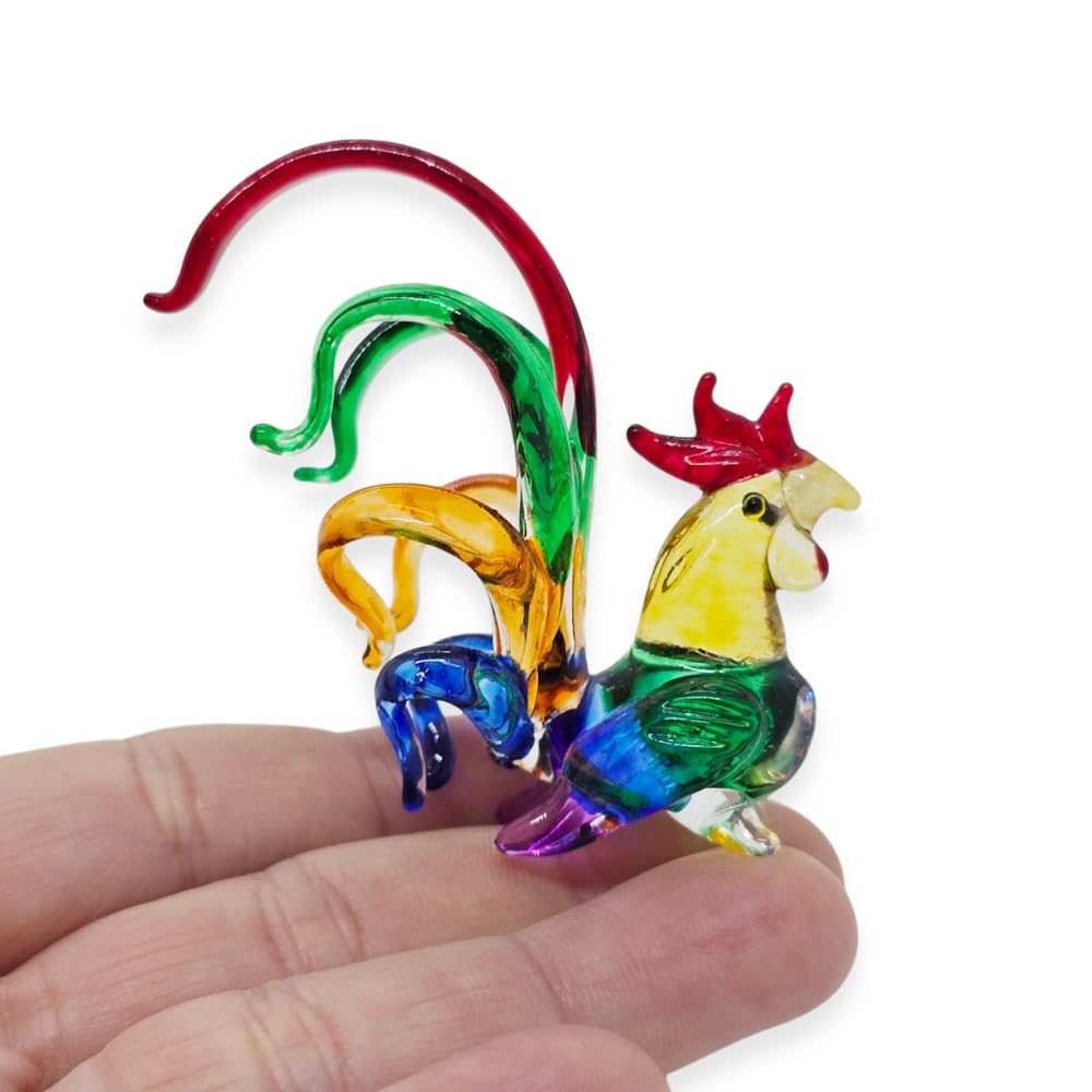 WitnyStore Tiny 2¼" Rainbow Multicolor Rooster Figurine - Miniature Hand Blown Painted Glass Chicken Hen Chick Fowl Poultry Bird Farm Animals Crystal Decorative Collectible Figure Décor Gifts