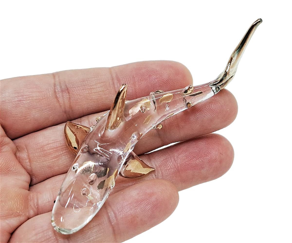 WitnyStore Tiny 3" Long Clear Whale Shark Gold Fins Figurine - Miniature Hand Blown Glass Sharks Marine Sea Life Ocean Fish Small Crystal Animals Decorative Figures Collectible Figurines Décor Gifts