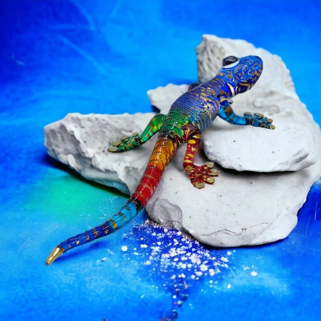WitnyStore Tiny 8" Rainbow Multicolor Gold Dotted Gecko Figurine Miniature Hand Blown Painted Glass Geckoes Lizard Salamander Reptile Colorful Crystal Animals Decorative Collectible Figure Décor Gifts—